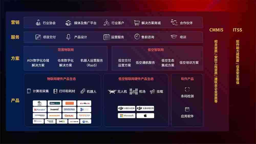 聚合国内外先进的物联网硬件产品品牌,,,聚焦数字化仓储、、机器人运营、、、低空智联网等领域,,共同打造适合客户业务场景的解决方案并提供交付服务